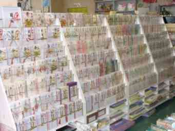 ■金封コーナー 日本人のお祝い事には欠かせない金封(のし袋)。 とにかく華やかで、売り場で一番目立つコーナーです。 結婚式用の新柄金封から目録、お悔やみ袋まで200種類以上揃えました。 |